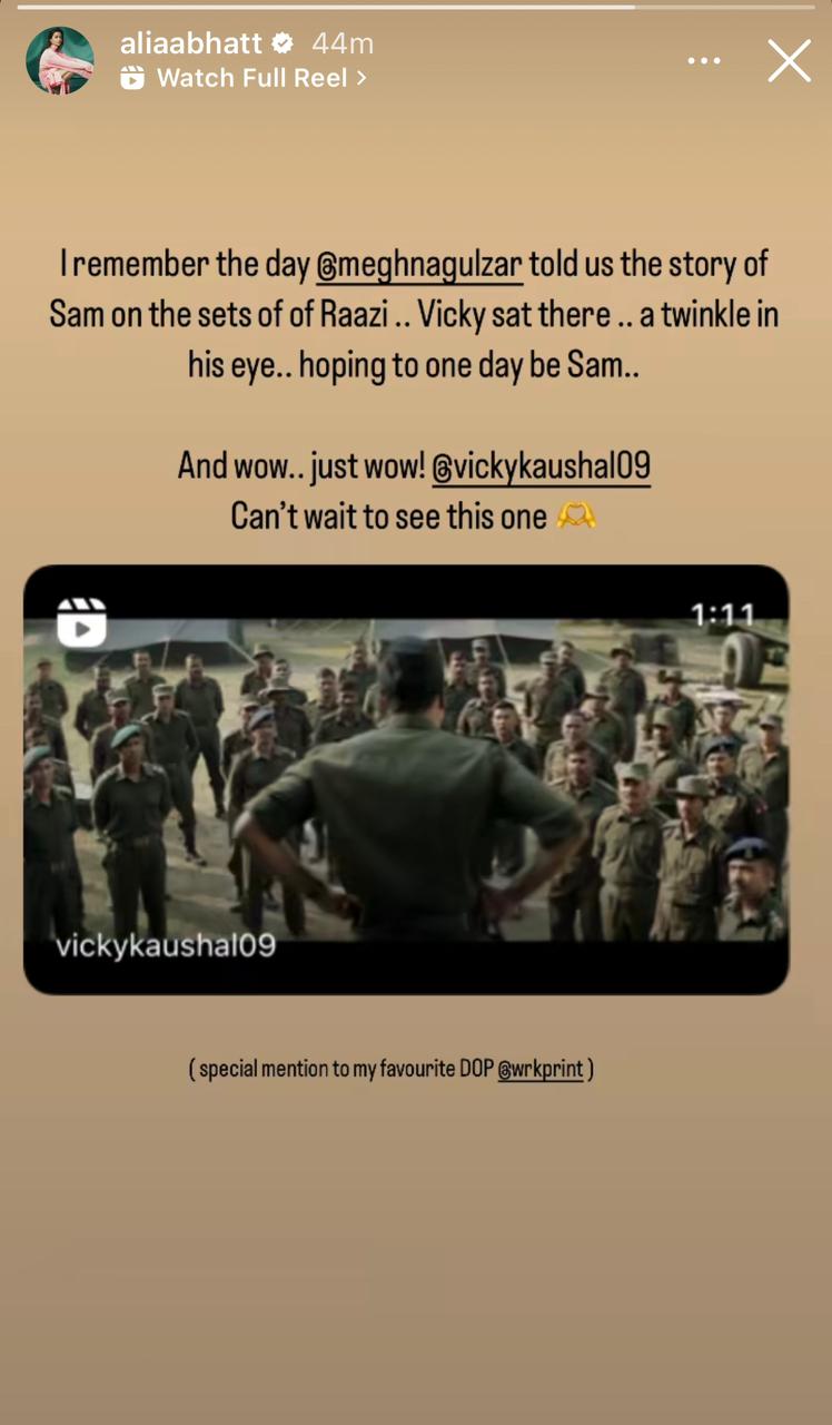 आलिया ने अपने ऑफिशियल इंस्टाग्राम हैंडल पर स्टोरी में 'सैम बहादुर' का टीजर शेयर किया है। इसके साथ ही 'रॉकी और रानी की प्रेम कहानी' एक्ट्रेस ने लिखा है- ''मुझे आज भी याद है जब मेघना गुलजार ने राजी के सेट पर हमें सैम बहादुर की कहानी को सुनाया था।
