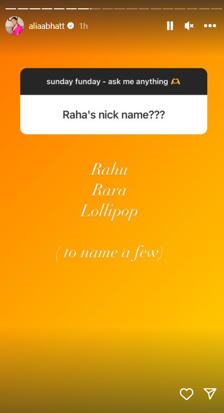 इस दौरान आलिया भट्ट से एक फैन उनकी बेटी राहा के निकनेम के बारे में पूछ। इसके जवाब में एक्ट्रेस ने लिखा, 'राहु, रारा और लॉलीपॉप है। इन तीन नाम से रणबीर कपूर और आलिया भट्ट अपनी बेटी राहा को पुकारते हैं।