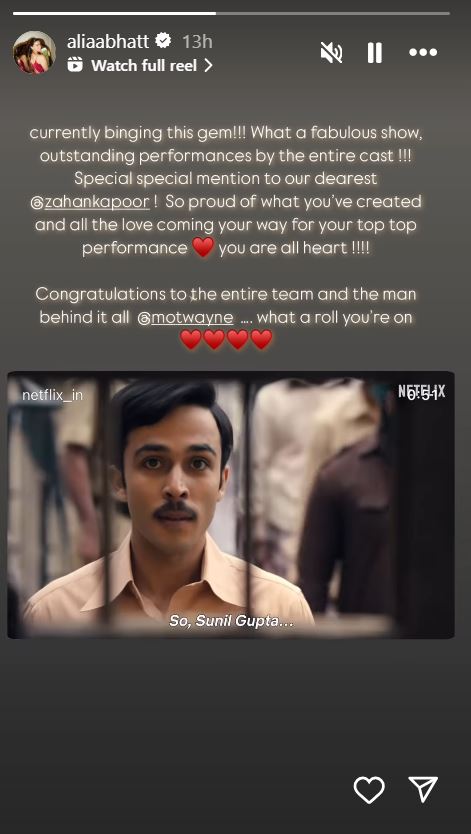 आलिया भट्ट ने अपने ऑफिशियल इंस्टाग्राम अकाउंट पर सीरीज का एक पोस्ट लेते हुए लिखा, फिलहाल ये शो देख रही हूं। क्या कमाल का शो है। पूरी टीम ने काफी शानदार परफॉरमेंस दी है। और स्पेशल मेंशन देना चाहूंगी हमारे सबसे प्यारे जहान को।' एक्ट्रेस ने पोस्ट में आगे जहान को लेकर कहा कि वो काफी प्राउड महसूस कर रही हैं कि सीरीज में उन्होंने इतना अच्छा काम किया है। इसके अलावा आलिया ने शो की पूरी टीम को भी बधाई दी कि उन्होंने कमाल के शो को बनाया।