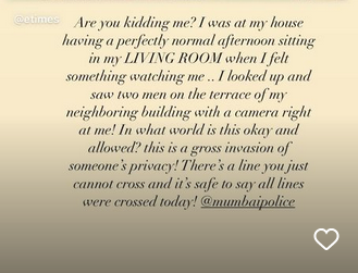 आलिया भट्ट ने इंस्टाग्राम स्टोरीज पर अपने साथ हुई पूरी घटना की जानकारी दी है। उन्होंने लिखा, 'क्या सच में? मैं अपने घर पर थी, दोपहर में अपने लिविंग रूम में बैठी हुई थी। तब मुझे लगा कि कोई मुझे देख रहा है। मैंने ऊपर देखा और बगल वाली इमारत के छत पर मुझे दो लोग कैमरे के साथ दिखे। किस दुनिया में इस तरह की हरकत को सही ठहराया जाता है और क्या इसकी अनुमति है? यह किसी की निजता पर आक्रमण करना है। एक लाइन है, जिसे आपको पार नहीं करना चाहिए। लेकिन, आज आपने सभी रेखाएं पार कर ली हैं। मुंबई पुलिस मदद करें।' इसके साथ ही आलिया ने ईटाइम्स द्वारा शेयर की गईं तस्वीरों को भी पोस्ट किया है।