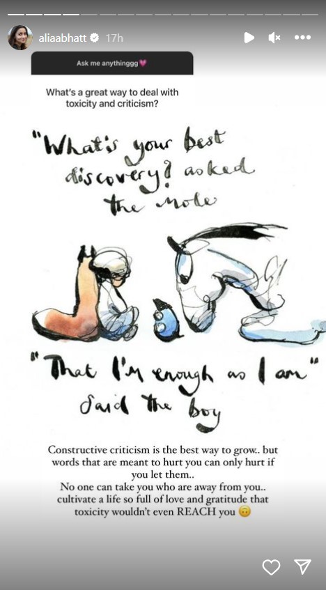 आलिया भट्ट ने इस सवाल का जवाब देते हुए कहा, "अच्छी आलोचना आगे बढ़ने का सबसे बढ़िया तरीका है, लेकिन जो शब्द आपको ठेस पहुंचाने के लिए हैं वे आपको केवल तभी तकलीफ पहुंचा सकते हैं जब आप उन्हें ऐसा करने देंगे। जो आपसे दूर है वो आपसे कुछ भी नहीं ले सकता। अपनी जिंदगी को इतने प्यार और कृतज्ञता से भर दें कि नफरत आप तक पहुंच ही ना पाए।"