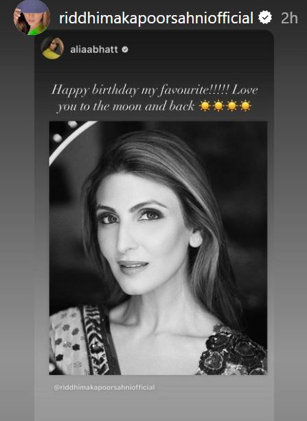 'गंगूबाई काठियावाड़ी' फेम एक्ट्रेस आलिया भट्ट ने इंस्टाग्राम स्टोरी पर ननद रिद्धिमा कपूर के लिए बर्थडे पोस्ट शेयर कर खूब प्यार लुटाया है। एक्ट्रेस ने रिद्धिमा की एक तस्वीर शेयर की है और कैप्शन में लिखा है, "मेरी फेवरेट को जन्मदिन की बधाई। मैं तुमसे बहुत और बिना शर्त प्यार करती हूं।"