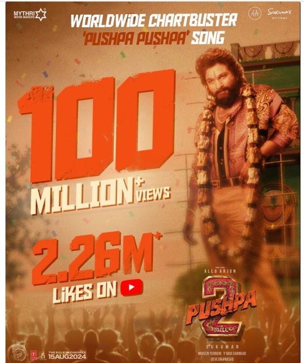 साल 2021 में रिलीज हुई पुष्पा- द राइज को हिट बनाने के पीछे उसके गानों ने भी अहम योगदान दिया था। ठीक उसी तरह से पुष्पा- द रूल के लिए भी मेकर्स ने प्लानिंग कर दी है और ट्रेलर से पहले फिल्म के गाने लगातार रिलीज किए जा रहे हैं। 1 मई 2024 को पुष्पा 2 का टाइटल सॉन्ग पुष्पा-पुष्पा को रिलीज किया गया। ऐसे में अब 27 दिन बाद अल्लू अर्जन के इस गीत ने वर्ल्डवाइड यूट्यूब पर 100 मिलियन व्यूज हासिल कर रिकॉर्ड बना डाला है।