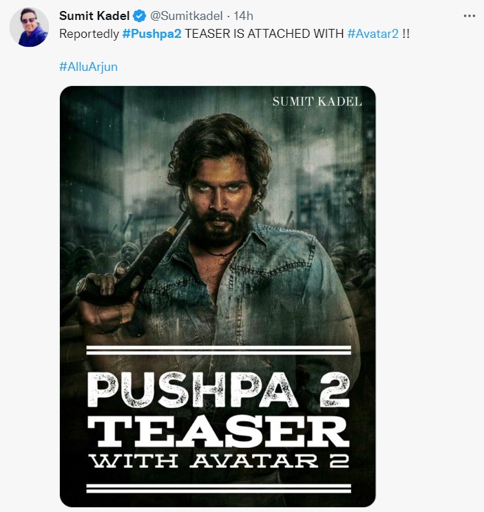 अवतार के साथ ही पुष्पा 2 का टीजर लॉन्च किया जाएगा। हालांकि, इस पर ऑफिशियल कंफर्मेशन अभी तक नहीं आया है। लेकिन ट्रेड एक्सपर्ट की चर्चा के अनुसार, 'अवतार 2' देखने थिएटर्स में पहुंचने वाले दर्शकों को 'पुष्पा 2' की झलक देखने को मिलेगी। बता दें कि 16 दिसंबर को अवतार 2 रिलीज हो रही है, जबकि 17 दिसंबर को 'पुष्पा: द राइज' को रिलीज हुए एक साल हो जाएगा।