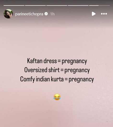 ऐसे में परिणीति चोपड़ा ने नेटीजंस को करारा जवाब भी दिया और अपने इंस्टाग्राम स्टोरी पर एक पोस्ट शेयर करते हुए लिखा- काफतान ड्रेस= प्रेगनेंसी, ओवरसाइज शर्ट= प्रेगनेंसी और कॉम्फी इंडियन कुर्ता= प्रेगनेंसी।" इसी के साथ हंसने वाला इमोजी भी बनाया। अभिनेत्री ने अपने इस पोस्ट से साफ-साफ कह दिया है कि वह प्रेग्नेंट नहीं है।