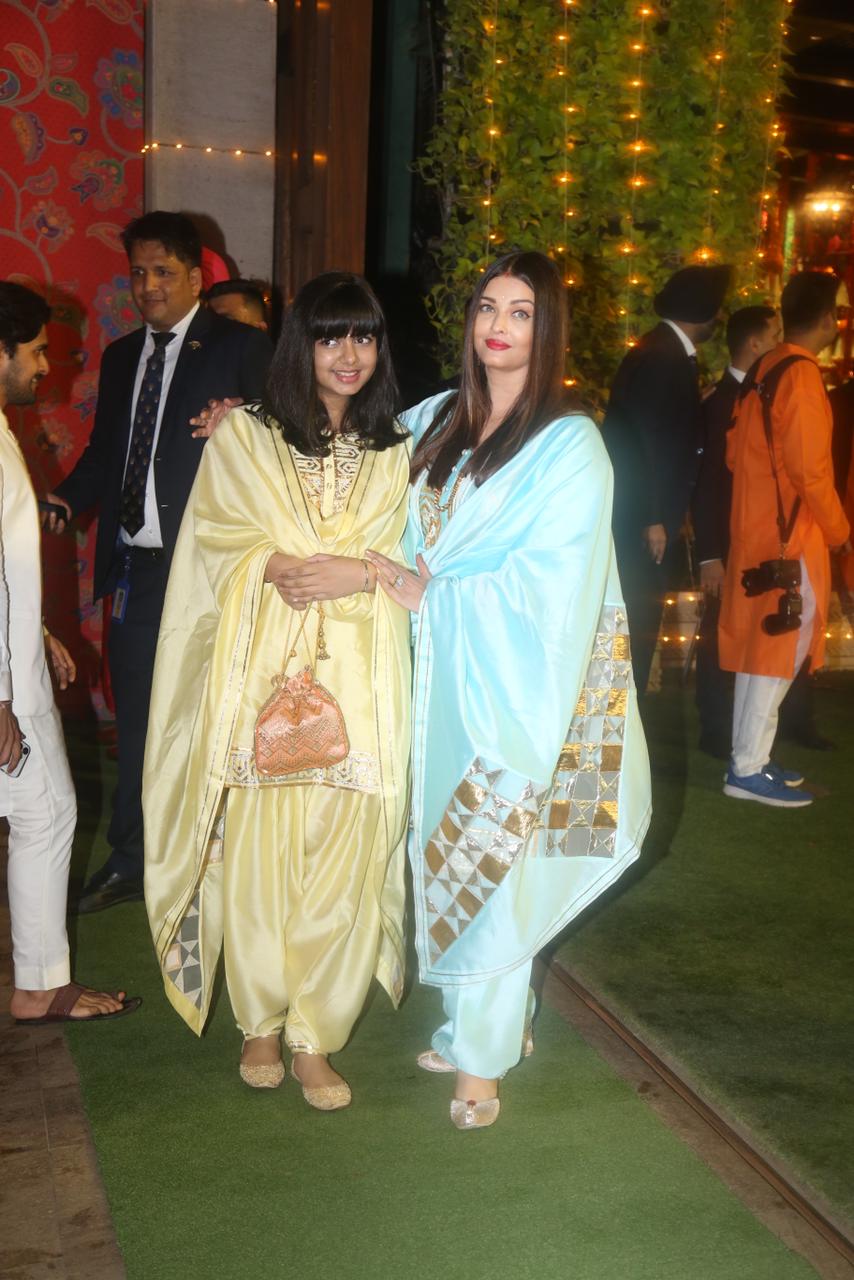 ऐश्वर्या राय और आराध्या बच्चन ने अपने सूट- सेट को मोजड़ी जुत्ती के साथ पेयर- अप किया। आराध्या पीच कलर का एक पोटली बैग भी हाथ में लिए हुए नजर आईं। अंबानी की इस पार्टी से ऐश्वर्या राय और आराध्या की तस्वीरें सोशल मीडिया पर लगातार वायरल हो रही हैं।