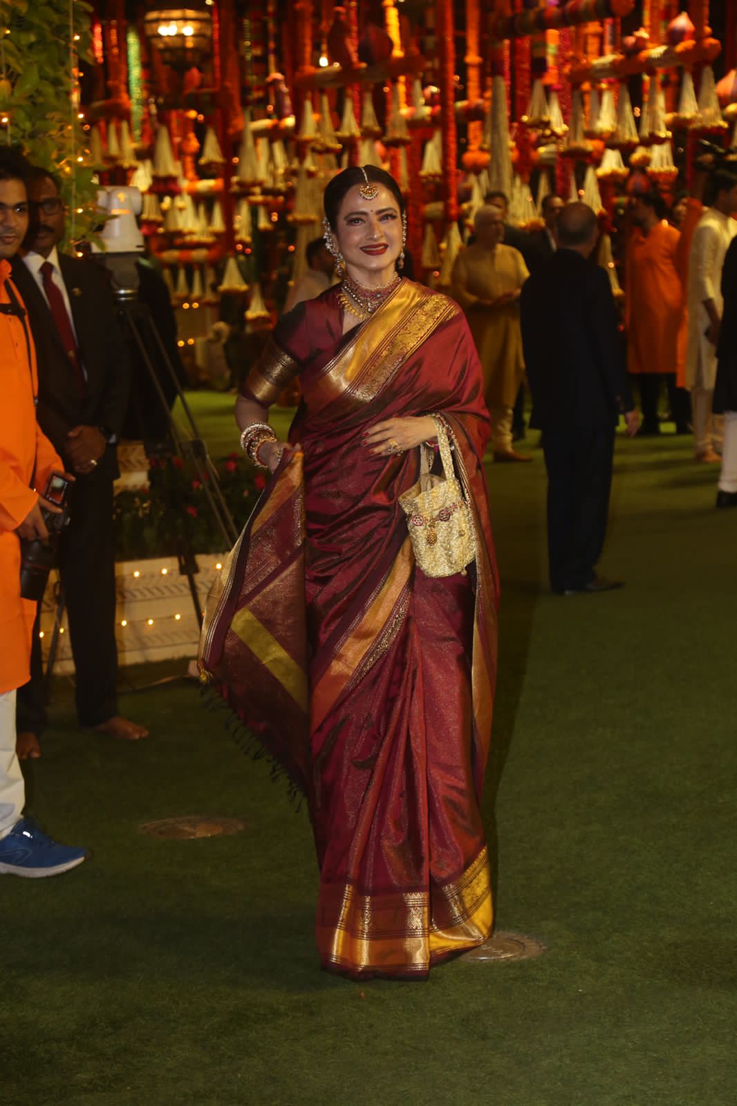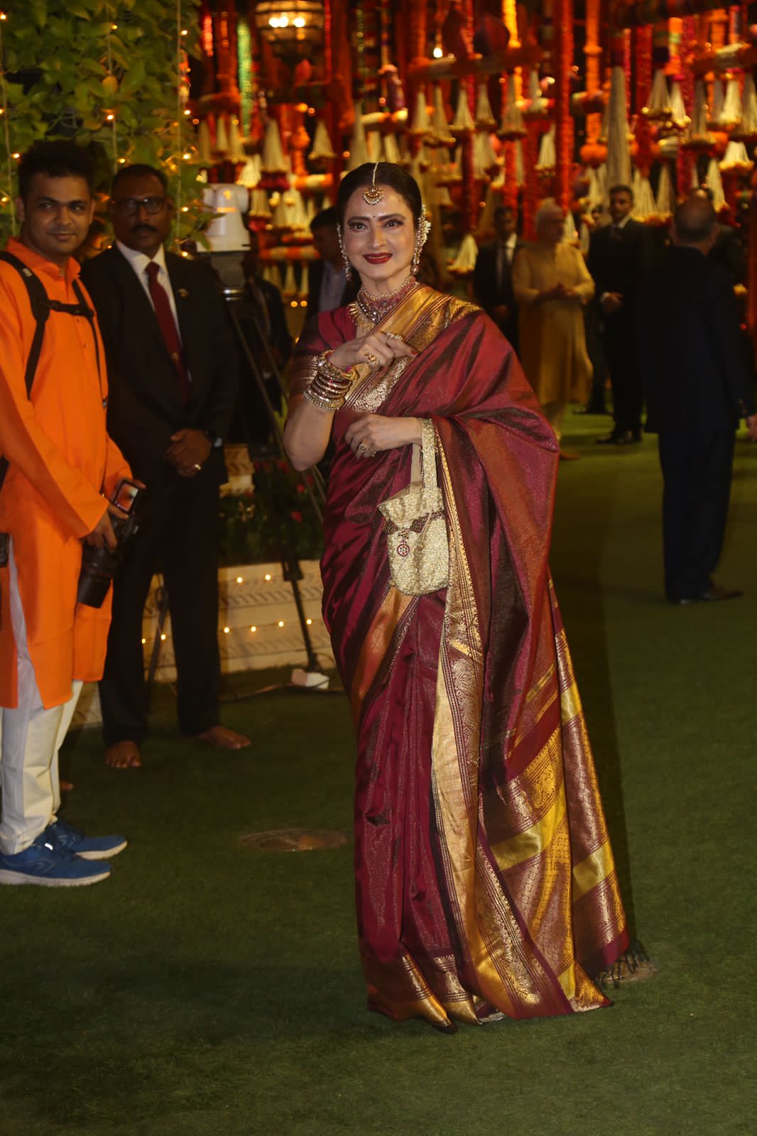 अंबानी परिवार के गणेश चतुर्थी सेलिब्रेशन में एक और अदाकार बड़ी हाइलाइट रहीं और वो हैं एवरग्रीन ब्यूटी रेखा। एक्ट्रेस एक बार फिर अपने पॉपुलर कांजीवरम साड़ी लुक में नजर आईं। अंबानी के घर रेखा गोल्डन कलर के बॉर्डर वाली रेड कलर की बेहद खूबसूरत साड़ी में पहुंची।