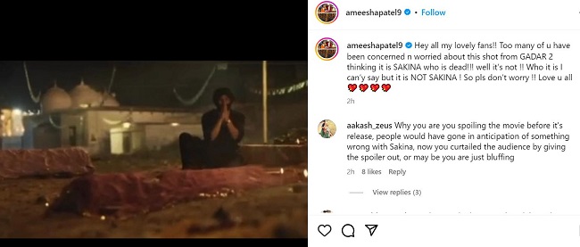 जबसे गदर 2 का टीजर रिलीज हुआ है। इस बात को लेकर उत्सुकता थी कि क्या यह सकीना की कब्र है। कई लोगों को लगता था कि तारा सिंह की पत्नी का निधन हो गया है। हाल ही में, फिल्म का नया गाना 'उड़ जा काले कावा' भी रिलीज हुआ है। इसमें अमीषा पटेल पर्पल आईज में नजर आ रही हैं क्योंकि पहली वाली फिल्म में उनकी आंखें इस रंग की नहीं है। इसलिए फैंस को लगा कि सकीना की मौत हो चुकी है। कई लोगों को अमीषा का यह स्पष्टीकरण अच्छा नहीं लगा है।