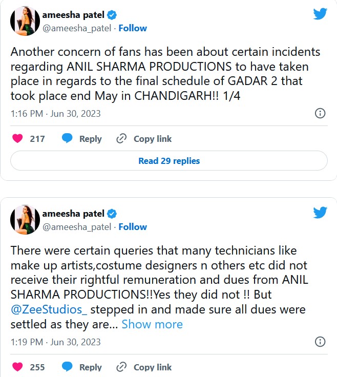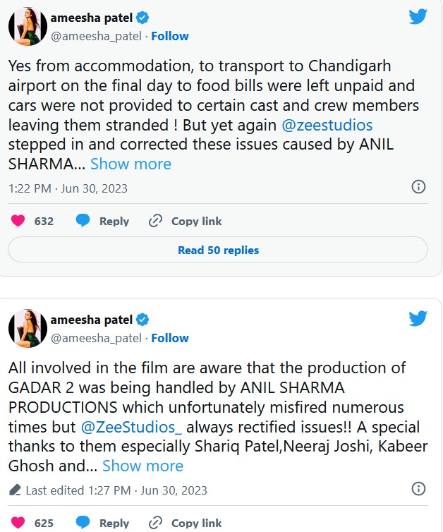 अमीषा पटेल ने अपने दूसरे ट्वीट में लिखा, ‘इन सभी लोगों को सैलरी ही नहीं, बल्कि शूटिंग पर रहने के दौरान हुए खर्चे और फ्लाइट के टिकट्स जैसे बिलों का भी पैसा नहीं मिला। यहां तक कि शूटिंग पर कहीं आने जाने के लिए कोई कार तक उपलब्ध नहीं कराई गई, जिससे वो रास्तों में फंसे रहे। फिर सभी परेशानियों को देखते हुए इस मामले में ZEE स्टूडियो ने एक्शन लिया और सभी के पैसों का भुगतान किया।' इसके साथ ही अमीषा ने अपने ट्वीट में शारिक पटेल, नीरज जोशी, कबीर घोष और निश्चित को धन्यवाद भी दिया।