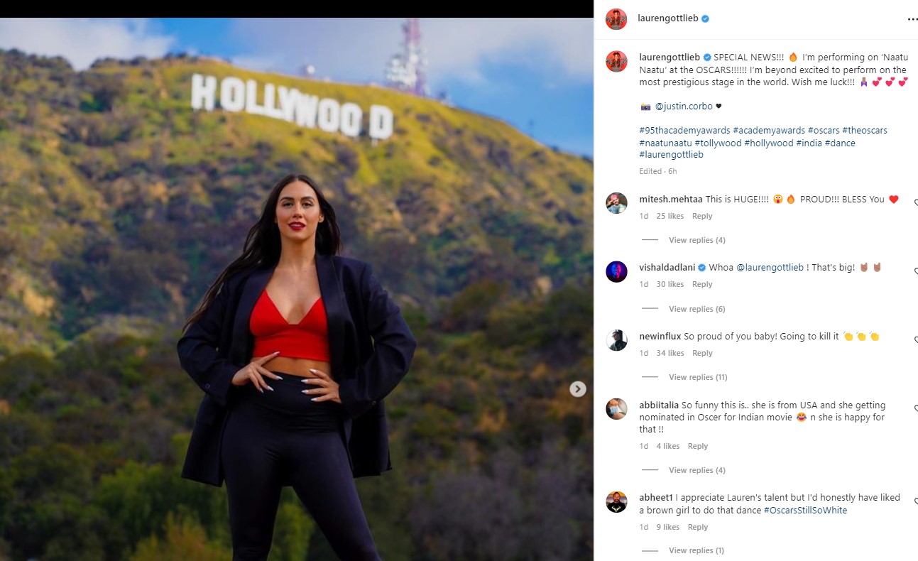 'झलक दिखला जा' फेम लॉरेन गोटलिब ने खुद इस न्यूज को कंफर्म किया है। वह अमेरिकी एक्टर और डांसर हैं। उन्होंने इंस्टाग्राम पर पोस्ट शेयर कर इस बात की जानकारी दी। लॉरेन ने लिखा, 'स्पेशल न्यूज!! ऑस्कर 2023 इवेंट में दुनिया के सबसे बड़े स्टेज पर मैं इंडिया को रिप्रेजेंट करने जा रही हूं। मैं नाटू-नाटू गाने पर परफॉर्म करने वाली हूं। इसके लिए मैं काफी उत्साहित हूं। मुझे गुड लक विश करिये।'