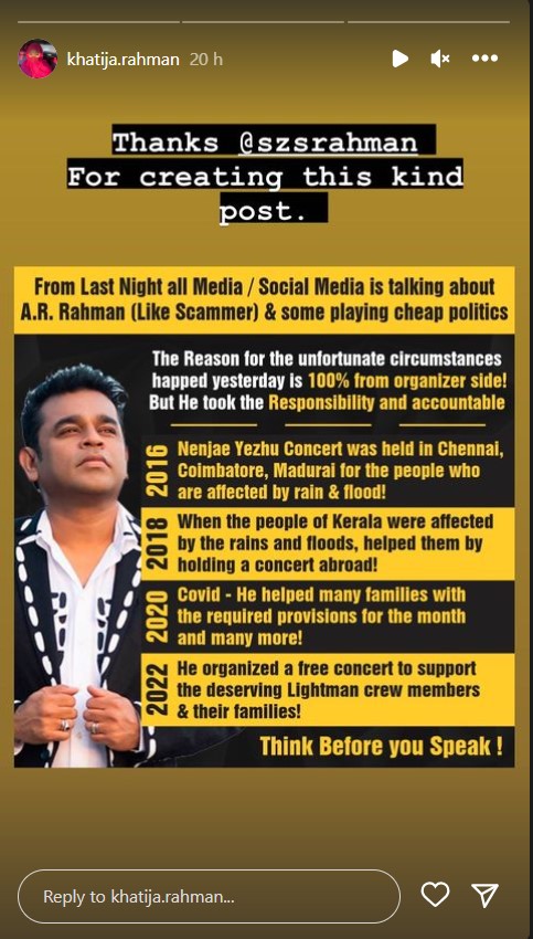 पोस्ट में आलोचकों से बोलने से पहले सोचने की सलाह दी गई है। पोस्ट में इस बात का भी जिक्र किया गया है कि एआर रहमान ने पहले 2016, 2018, 2020 और 2022 में बाढ़ पीड़ितों के लिए म्यूजिक कॉन्सर्ट आयोजित किए थे। उन्होंने कोविड में परेशान परिवारों और लोगों की भी मदद की थी।