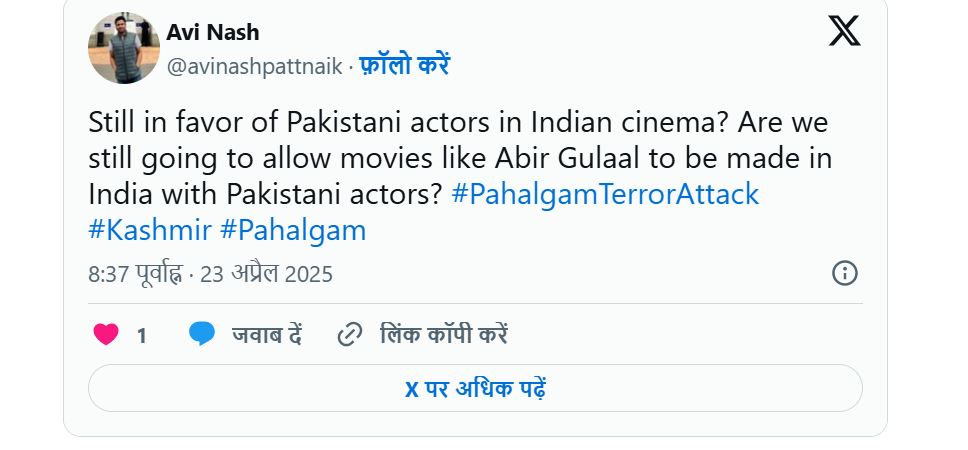 कश्मीर के पहलगाम में हुए आतंकी हमले ने पूरे देश को झकझोर कर रख दिया है। इस हमले में कई मासूम लोगों की जान चली गई जिससे आम जनता से लेकर सेलेब्रिटीज तक स्तब्ध हैं। इसी बीच पाकिस्तानी एक्टर Fawad Khan की आने वाली फिल्म अबीर गुलाल को लेकर विवाद खड़ा हो गया है। सोशल मीडिया पर लोग फिल्म को भारत में बैन करने की मांग कर रहे हैं।