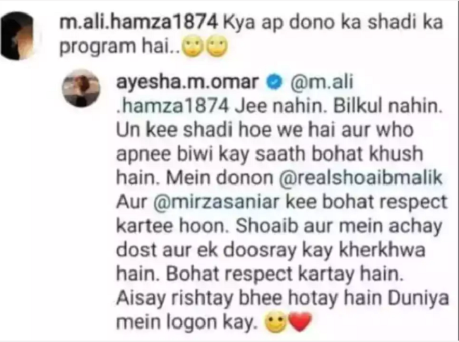 आयशा ओमर ने कहा था, 'जी नहीं, बिल्कुल नहीं। उनकी शादी हो गई है और वह अपनी बीवी के साथ बहुत खुश है। हम दोनों का बहुत रिस्पेक्ट करते है। शोएब और मैं अच्छे दोस्त और एक-दूसरे के खैरख्वाह है। बहुत रिस्पेक्ट करते हैं। ऐसे रिश्ते भी होते हैं दुनिया में।' अब इस कमेंट का स्क्रीनशॉट वायरल हो रहा है। इस बीच सानिया मिर्जा सोशल मीडिया पर क्रिप्टिक पोस्ट कर रही हैं। हाल ही में उन्होंने एक इमोशनल पोस्ट भी किया था।