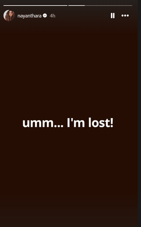 नयनतारा (Nayanthara) और विग्नेश (Vignesh) को साउथ इंडस्ट्री के पावर कपल में गिना जाता है। ऐसे में अभिनेत्री का नया पोस्ट देख फैंस थोड़ा हैरान हो रहे हैं। नयनतारा ने गुरुवार सुबह इंस्टाग्राम स्टोरी पर लिखा, 'Ummm ... आई एम लॉस्ट।'