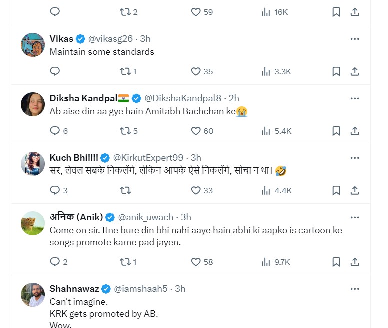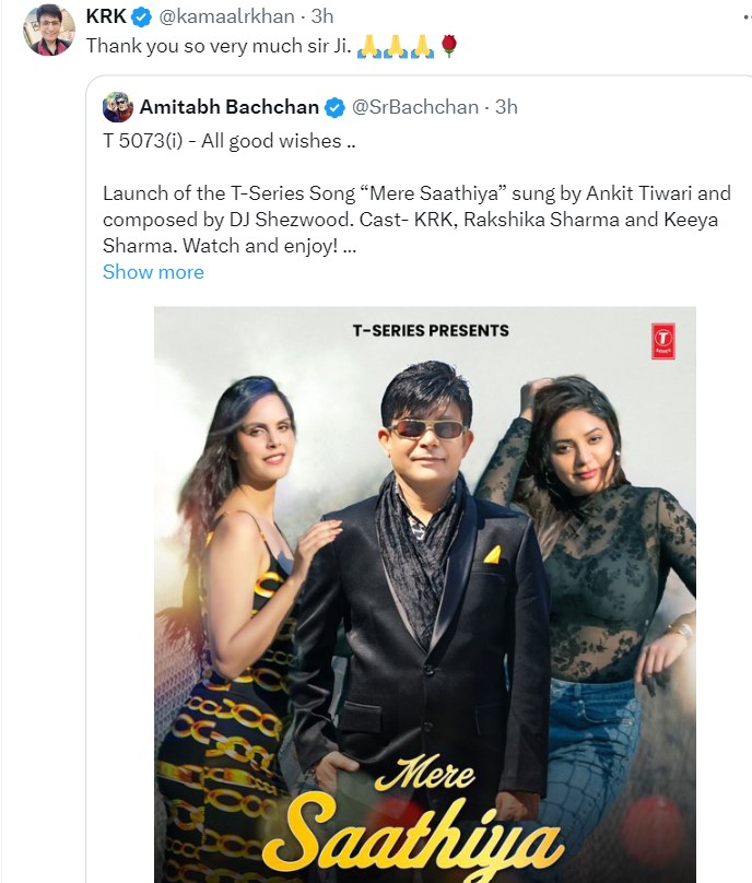 अमिताभ बच्चन ने केआरके को उनके नए गाने के लिए शुभकामनाएं दी हैं। उन्हें ऐसा करता देख फैंस ने तरह-तरह के कमेंट्स किए हैं। एक ने लिखा, 'अपना स्टैंडर्ड मेंटेन करिये सर।' एक ने कमेंट किया, 'सर, लेवल सबके निकलेंगे, लेकिन आपके ऐसे निकलेंगे, सोचा न था।' इसके साथ यूजर ने स्माइली वाली इमोजी बनाई है।