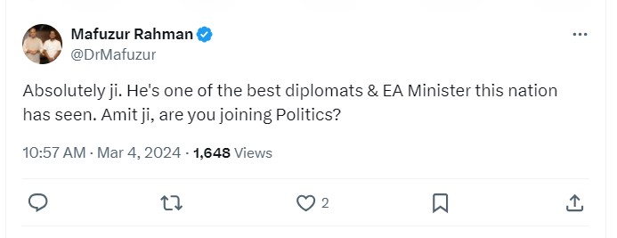 अमिताभ बच्चन ने एस जयशंकर का वीडियो शेयर करते हुए लिखा, "वाह.. !!! बिल्कुल ठीक कहा सर आपने..।" बिग बी के इस कमेंट पर कई फैंस ने उनकी तारीफ की। वहीं, कुछ लोगों ने उनसे पूछा कि क्या वो अब राजनीति में जाने का मन बना रहे हैं।