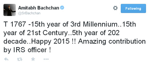 अमिताभ ने अपनी बात को कुछ घुमा-फिराकर लिखा है। उन्होंने ट्वीट किया, 'तीसरे मिलेनियम का 15वां साल...21वीं सदी का 15वां साल...202वें दशक का 5वां साल....हैप्पी 2015। एक आईआरएस अधिकारी का शानदार योगदान।'
