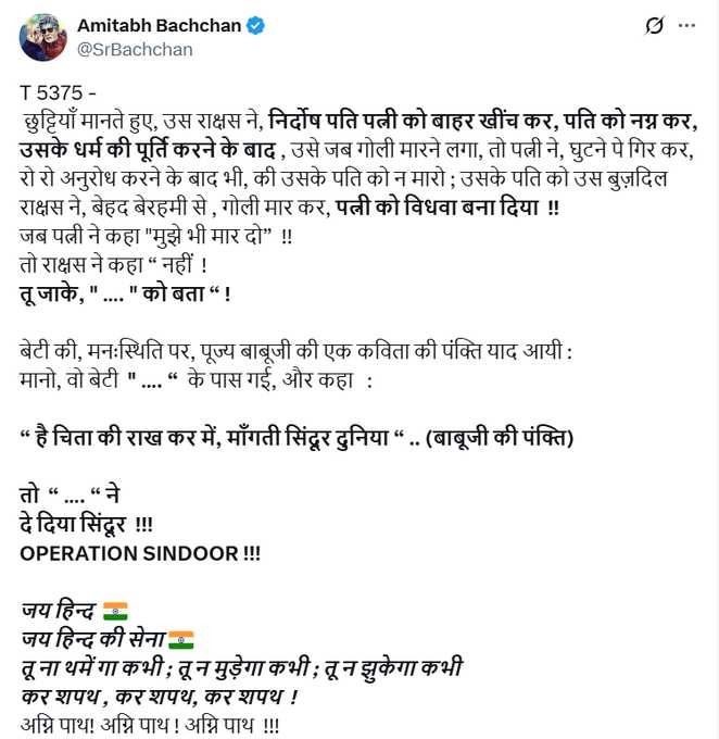 हमले और ऑपरेशन के दौरान अमिताभ की चुप्पी ने सोशलl मीडिया पर हंगामा मचा दिया था। कई यूजर्स ने उन्हें "डरपोक" और "स्वार्थी" तक कहा था। लोग पूछ रहे थे कि वह कब बोलेंगे। 23 अप्रैल को उनकी एक क्रिप्टिक पोस्ट "T 5356 -" ने और सवाल खड़े किए। लेकिन अब उनकी ताजा पोस्ट ने फैंस और आलोचकों का ध्यान खींचा है।