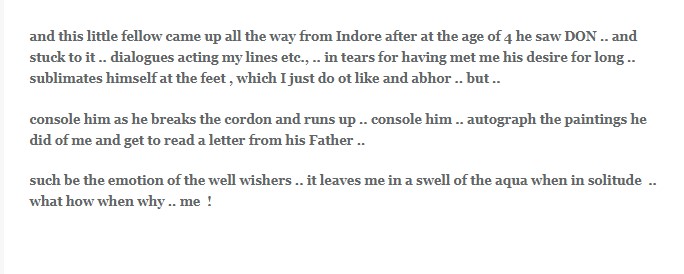 अमिताभ बच्चन ने अपने ब्लॉग में इस घटना के बारे में बताते हुए आगे लिखा, 'उसने सुरक्षा घेरा तोड़ा था और वह भागा, लेकिन मैंने उसे सांत्वना दीमैंने उसे सांत्वना दी। उसके पास जो मेरी पेंटिंग थी, मैंने उस पर ऑटोग्राफ दिया और उसके पिता द्वारा दिए गए खत को भी पड़ा। मेरे चाहने वालों की ऐसी भावनाएं, मुझे पूरी तरह से अभिभूत कर देती हैं'। कुछ समय पहले ही अमिताभ बच्चन ने अपने एक ब्लॉग में अपनी भावनाएं व्यक्त करते हुए कहा था कि अब समय बदल गया है।अब रविवार को मेरे घर के बाहर वह भीड़ नहीं होती, जो कई सालों पहले हुआ करती थी।