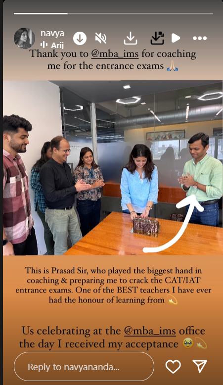 पहली तस्वीर में उन्हें ब्लैक कलर के सूट में एक बोर्ड के साथ देखा जा सकता है जिसपर आईआईएम लिखा हुआ है। इसी के साथ उन्होंने अपनी इंस्टाग्राम स्टोरी में एक तस्वीर शेयर की है जिसमें वो केक कटिंग के साथ इसे सेलिब्रेट कर रही हैं। उन्होंने अपने प्रसाद सर को भी धन्यवाद दिया जिन्होंने उन्हें कैट (CAT Exam) का एग्जाम क्लियर करने में उनकी मदद की।