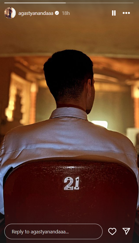 'द आर्चीज' के बाद अब अगस्त्य नंदा जल्द अपनी अपकमिंग फिल्म इक्कीस में नजर आएंगे, जिसकी एक झलक उन्होंने इंस्टाग्राम स्टोरी पर शेयर की है, जिसमें वे चेयर पर बैठे नजर आ रहे हैं और उस पर पीछे 21 लिखा हुआ है ।