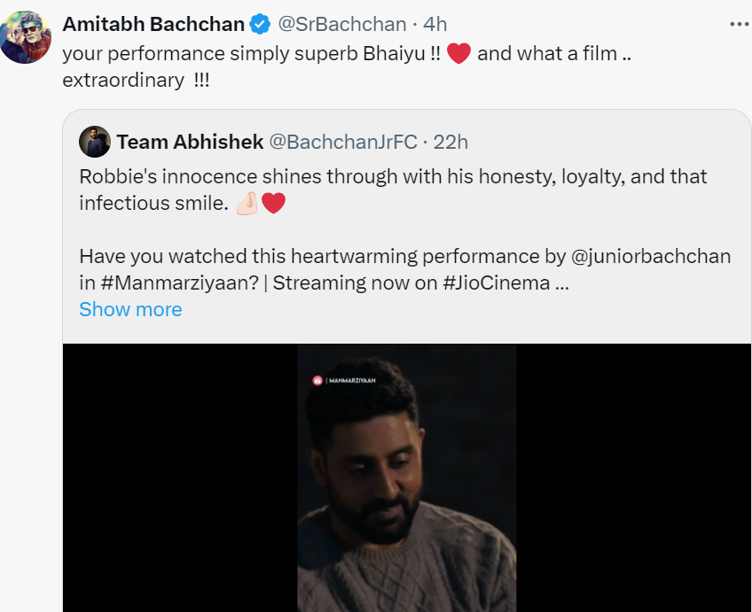 अमिताभ बच्चन अपने काम के साथ-साथ अपने फैंस के लिए भी समय निकाल ही लेते हैं। वह अक्सर सोशल मीडिया पर पोस्ट कर फिल्म और स्टार्स की तारीफ करते हैं। अब हाल ही में उन्होंने एक पोस्ट किया और अपने बेटे एक्टर अभिषेक बच्चन की तारीफ की। यह पोस्ट अभिषेक बच्चन और तापसी पन्नू स्टारर फिल्म मनमर्जियां से जुड़ा था।