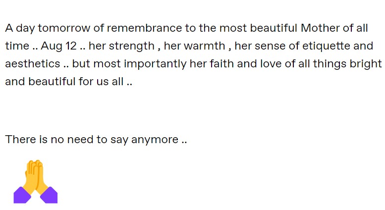 इसे आगे उन्होंने लिखा कि 12 अगस्त, उनकी ताकत, उनकी गर्मजोशी, उनके शिष्टाचार और सौंदर्य की भावना, लेकिन सबसे महत्वपूर्ण बात यह है कि हम सभी के लिए उज्ज्वल और सुंदर सभी चीजों के प्रति उनका विश्वास और प्यार। अब और कुछ कहने की जरूरत नहीं है।
