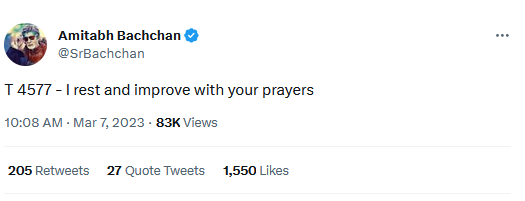 'प्रोजेक्ट के' की शूटिंग के दौरान घायल के बाद अब अमिताभ बच्चन एक बार फिर से ट्विटर पर नजर आए हैं। उन्होंने अपने आधिकारिक ट्विटर अकाउंट पर ट्वीट शेयर कर अपना हाल बताया है। अमिताभ ने लिखा, 'मैं आपकी प्रार्थनाओं से ठीक हो रहा हूं और आराम कर रहा हूं।' इस ट्वीट के बाद फैंस को काफी राहत मिली है। हर कोई कमेंट कर बिग बी के जल्द ठीक होने की दुआ कर रहा है।