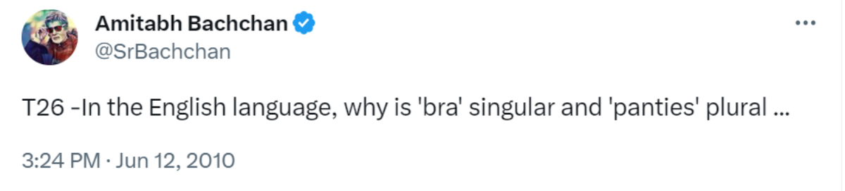 अमिताभ का यह ट्वीट 2010 का है, जो 12 जून को किया गया था। इस ट्वीट में उन्होंने सवाल किया था- अंग्रेजी भाषा में, 'ब्रा' एकवचन और 'पैंटीज' बहुवचन क्यों है?