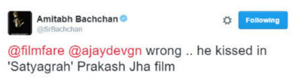 जी हां, अजय को लेकर मीडिया रिपोर्टों में सामने आ रही इस तरह की बातों पर नजर पड़ते ही अमिताभ ने तुरंत ट्वीट कर कहा, 'गलत, उन्होंने प्रकाश झा की 'सत्याग्रह' में किस किया था।'