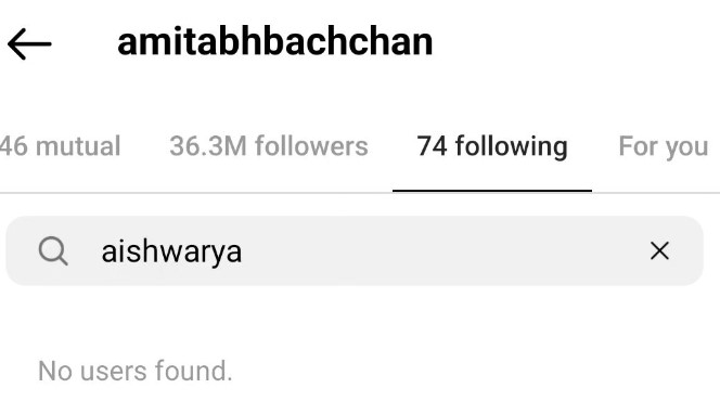 लेकिन इस लिस्ट में उनकी बहूरानी और बॉलीवुड एक्ट्रेस ऐश्वर्या राय बच्चन का नाम नहीं है। कहा ये भी जा रहा है कि अमिताभ बच्चन ने कभी भी ऐश को इंस्टाग्राम पर फॉलो नहीं किया था। जबकि कुछ फैंस ये अनुमान लगा रहे हैं कि बच्चन फैमिली में सब कुछ ठीक नहीं चल रहा है।