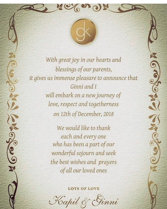 कपिल शर्मा अपनी 12 दिसंबर को अपनी दोस्त गिन्नी चतरथ के साथ शादी करने वाले हैं। शादी का समारोह 10 दिसंबर से शुरू होगा। इस दिन कपिल की बहन के घर पर माता का जागरण होगा। अगले दिन गिन्नी के होमटाउन में संगीत और मेहंदी की रस्म होगी।