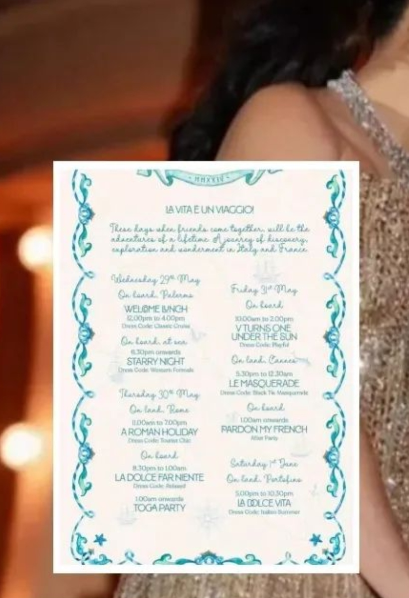 30 मई की रात की थीम "ला डोल्से फार निएंटे" है और इसके बाद रात 1 बजे "टोगा पार्टी" होगी। अगले दिन की थीम हैं "वी टर्न्स वन अंडर द सन," "ले मास्करेड," और "पार्डन माई फ्रेंच।" अंतिम दिन यानी शनिवार को थीम "ला डोल्से वीटा" होगी जिसमें इटालियन समर का ड्रेस कोड होगा। इस कार्ड के बाद अब फैंस इस फंक्शन की तस्वीरों का इंतजार कर रहे है।