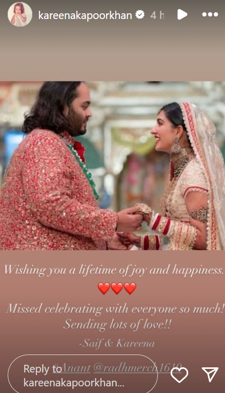 एक्ट्रेस ने अनंत-राधिका की वेडिंग फोटो शेयर करते हुए लिखा कि आपके जीवन भर की खुशियां और आनंद की कामना करती हूं। सबके साथ सेलिब्रेशन मनाना बहुत याद आया। ढेर सारा प्यार भेज रही हूं। उन्होंने यह भी बताया कि यह संदेश उनके और उनके पति सैफ अली खान दोनों की तरफ से था।