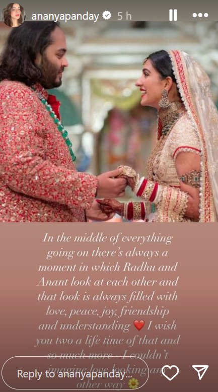 अनन्या पांडे इस शाही शादी का हिस्सा बनी थीं। उन्होंने अनंत-राधिका की शादी को खूब एन्जॉय किया। इसके बाद शनिवार को एक्ट्रेस ने सोशल मीडिया पर एक पोस्ट किया और लिखा कि सब कुछ चल रहा है, उसके बीच में हमेशा एक पल आता है, जब राधू और अनंत एक-दूसरे को देखते हैं।