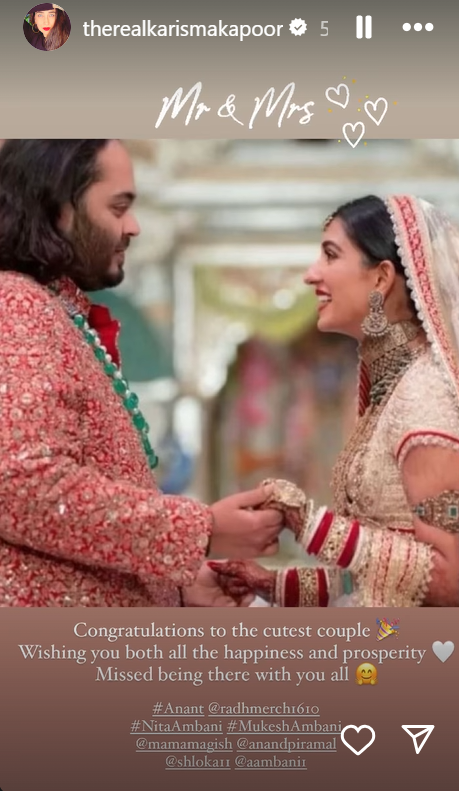 इनके अलावा करिश्मा कपूर ने भी कपल को विश किया। उन्होंने अपनी इंस्टाग्राम स्टोरी पर लिखा कि सबसे प्यारे कपल को बधाई। आप दोनों के लिए बहुत सारी खुशियां और समृद्धि की शुभकामनाएं। आप सभी के साथ वहां रहना मिस किया।