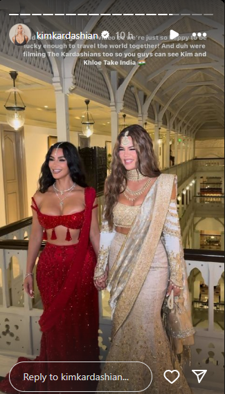 न्यूज 18 की रिपोर्ट के अनुसार शादी के लिए अपना और ख्लो का लुक शेयर करते हुए किम ने लिखा, “अपने वीडियो का स्क्रीनग्रैब लेना पड़ा क्योंकि हम एक बहुत खुश हैं और खुद को भाग्यशाली मानते हैं कि हमें एक साथ दुनिया घूमने का मौका मिला! और हां, हम द कार्दशियन भी शूट कर रहे हैं। तो आप लोग किम और ख्लो टेक इंडिया को देख पाएंगे।