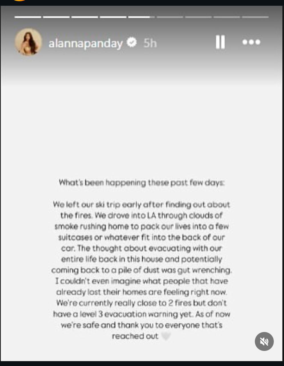 अलाना अपनी पोस्ट में ये भी बताया कि फिलहाल उनके घर तक नहीं पहुंची है मगर वो ज्यादा दूर भी नहीं है। पोस्ट में अलाना ने आगे लिखा, 'मैं कभी ये सोच भी नहीं कर सकती कि जो लोग पहले ही अपना घर खो चुके हैं, वे इस समय क्या फील कर रहे हैं। हम आग के करीब हैं लेकिन अभी तक लेवल 3 के एग्जिट का अलर्ट नहीं दिया गया है। फिलहाल हम सेफ हैं और मदद करने वाले सभी लोगों को थैंक्स।'
