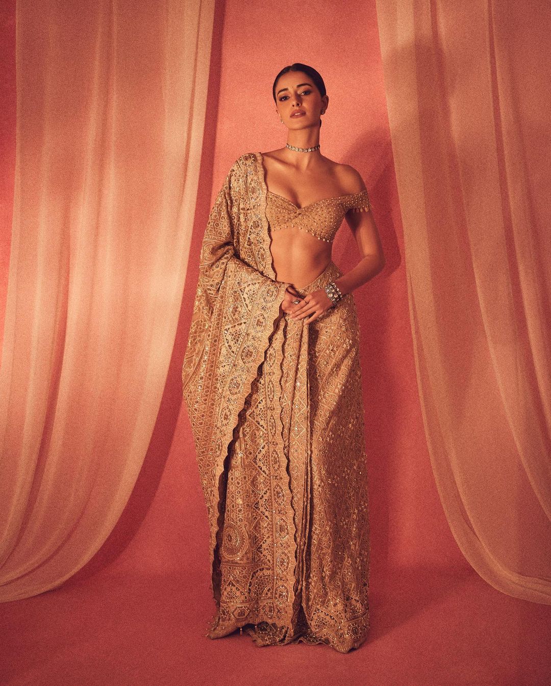 एक्ट्रेस अनन्या पांडे ने अपने सोशल मीडिया प्लेटफॉर्म इंस्टाग्राम पर गोल्डन कलर के लहंगे में कुछ तस्वीरें शेयर की हैं। इन तस्वीरों में अभिनेत्री अपना गॉर्जियस लुक फैंस को दिखाते हुए नजर आ रही हैं। अनन्या की तस्वीरों में देखा जा सकता है कि उन्होंने अपनी इस ड्रेस के साथ डीप नेक ब्लाउज पहना हुआ है। एक्ट्रेस ने अपने इस लुक को इयररिंग्स, चोकर नेकपीस और माथे पर छोटी सी बिंदी के साथ पूरा किया है।