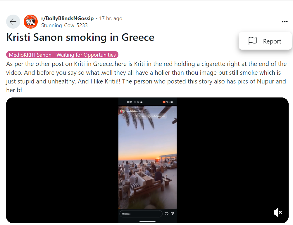 न्यूज 18 में छपी रिपोर्ट के मुताबिक, सोशल मीडिया प्लेटफॉर्म रेडिट पर एक उपयोगकर्ता ने दावा किया कि बर्थडे सेलिब्रेशन के वीडियो में कृति सेनन सिगरेट पीती नजर आई। हालांकि, इस पोस्ट पर कई लोग एक्ट्रेस के सपोर्ट में भी उतरे हैं। एक यूजर का कहना है कि “मुझे बात समझ में नहीं आती। लोग धूम्रपान करते हैं तो क्या? वह छुट्टी पर है, वह जो चाहे कर सकती है जो गैरकानूनी नहीं है। तो वहीं एक यूजर ने लिखा- अगर वो पी रही है तो पीने दो। ये कोई बड़ी बात नहीं।