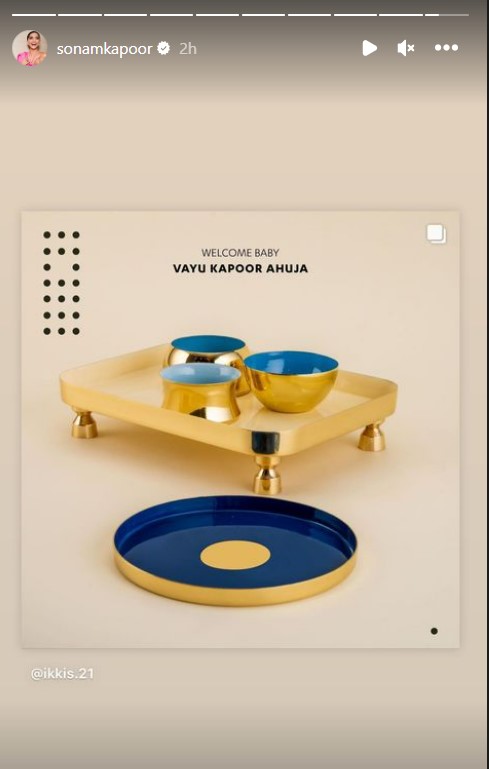 सोनम कपूर ने मई 2018 में बिजनसमैन आनंद आहूजा से शादी की थी। इसी साल 20 अगस्त को एक्ट्रेस ने बेटे वायु को जन्म दिया था। नामकरण सेरेमनी में वायु नाम को रखने की वजह, इसका मतलब और महत्व भी बताया था। अब एक्ट्रेस ने उनके बेटे को अनिल कपूर और सुनीता कपूर की तरफ से दिए गए गिफ्ट की तस्वीर शेयर की है। वायु कपूर के लिए डिजाइनर थाली और कुछ और बर्तन वेलकम गिफ्ट के तौर पर दिए गए हैं। लेकिन यह गिफ्ट यूं ही नहीं दिया गया है। इसके पीछे का कारण भी बड़ा निराला है।