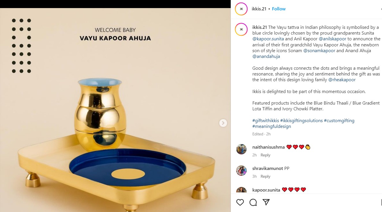 इक्किस.21 (ikkis.21) नाम के इंस्टाग्राम पेज पर वायु कपूर को दिए गए तोहफे की जानकारी शेयर की गई है। इसमें बताया गया है कि इंडियन फिलासफी में वायु तत्व नीले रंग के घेरे का प्रतीक माना जाता है। अनिल कपूर और सुनीता कपूर ने अपने नाती के वेलकम के लिए इस वजह से यह तोहफा चुना है।