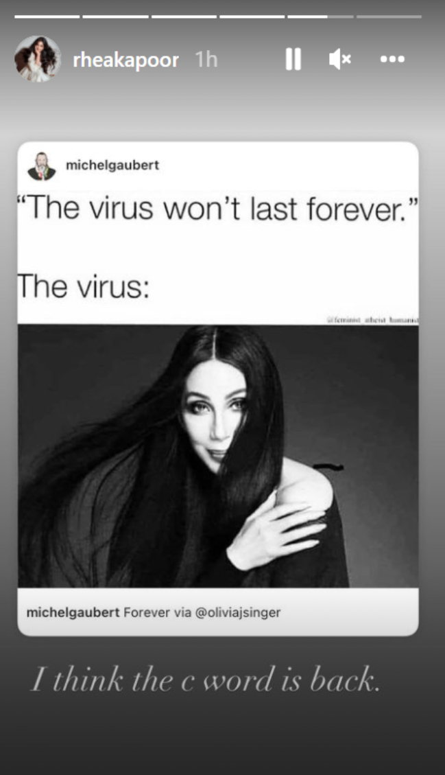 रिया ने एक मीम शेयर किया है, जिसमें कहा गया है कि द वायरस वॉन्ट लास्ट फॉरेवर यानी वायरस हमेशा नहीं रहेगा। एक तस्वीर के जरिए वायरस की ओर से जवाब दिखाय गया है, जैसे वो इंसान की इस सोच पर हंस रहा हो। रिया ने मीम के नीचे लिखा- मुझे लगता है कि सी-वर्ड लौट आया है। यहां सी का तात्पर्य कोरोना से हो सकता है। हालांकि, रिया ने अपने स्वास्थ्य के संबंध में कोई जानकारी अभी तक साझा नहीं की है।