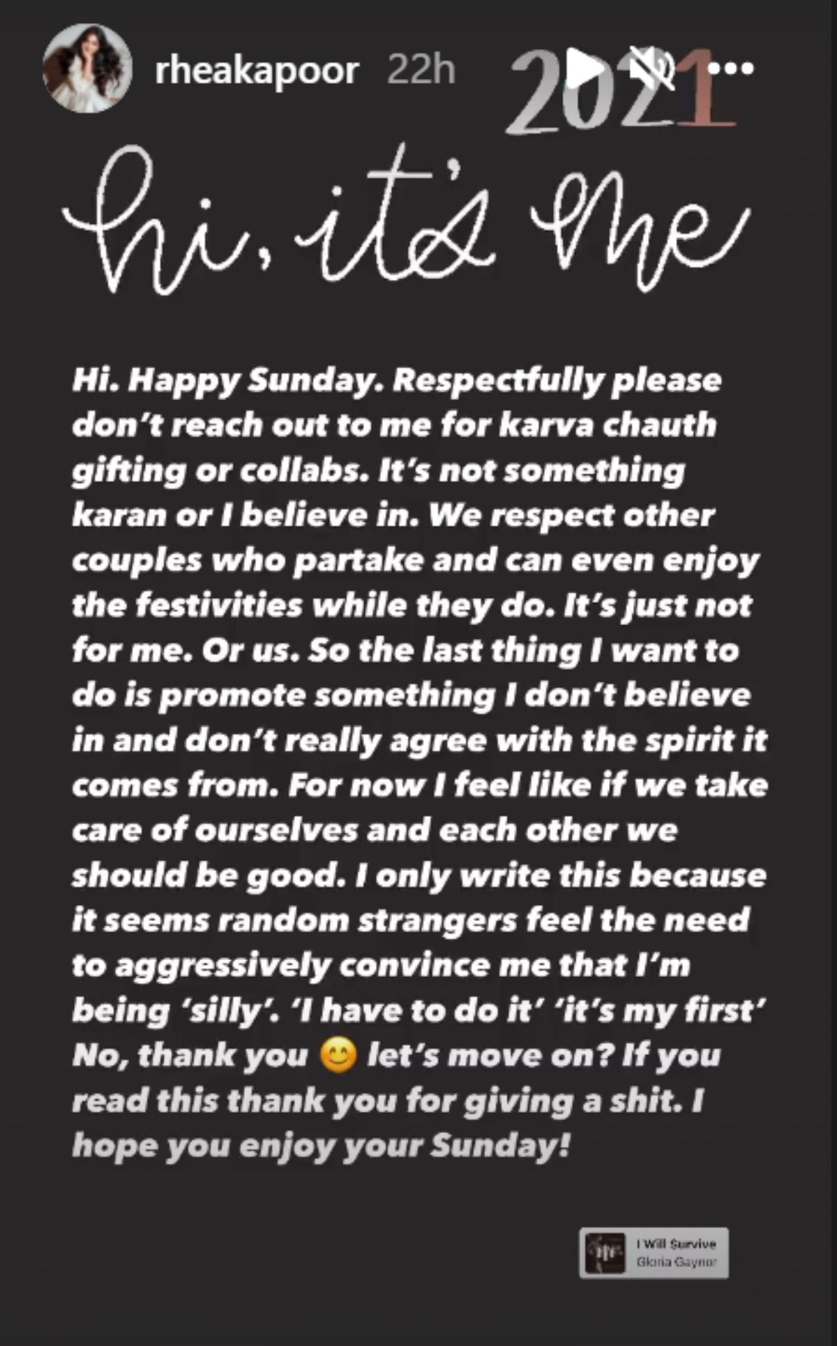 नई दिल्ली, जेएनएन। अनिल कपूर की बेटी रिया कपूर ने करवा चौथ को लेकर एक चौंकाने वाला एलान किया है। रिया ने कहा कि वो इस त्योहार को नहीं मनाएंगी। इसको लेकर उन्होंने सोशल मीडिया में एक पोस्ट भी शेयर की है, जिसमें रिया ने ऐसा करने के पीछे वजह को साफ़ किया है।