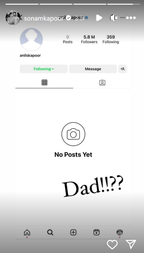 सोनम कपूर ने अपने सोशल मीडिया हैंडल इंस्टाग्राम पर अनिल कपूर के पेज को स्टोरी पर शेयर किया है और इस पर अपना रिएक्शन देते हुए सवाल किया है। एक्ट्रेस ने स्टोरी के कैप्शन में लिखा 'डैड?'।