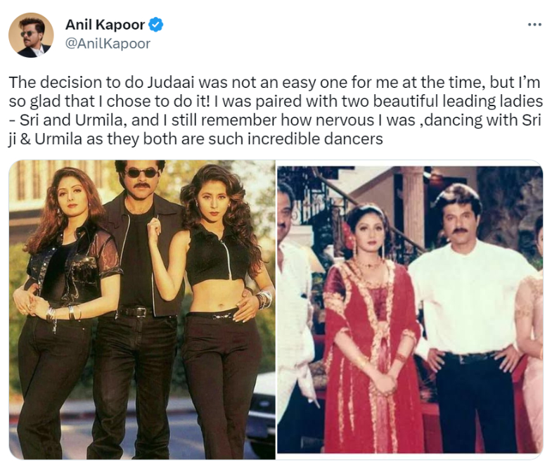 अनिल ने अपने ट्वीट में लिखा- उस वक्त जुदाई में काम करने का फैसला लेना मेरे लिए आसान नहीं था, लेकिन मुझे खुशी है कि मैंने इसे चुना। मेरी जोड़ी दो बेहद खूबसूरत महिलाओं के साथ बनायी गयी थी- श्री और उर्मिला, और मुझे अभी भी याद है कि श्री जी और उर्मिला के साथ नाचते वक्त मैं कितना नर्वस था। दोनों ही अद्भुत डांसर हैं।