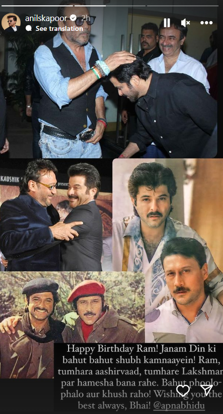 अनिल कपूर ने इंस्टाग्राम स्टोरी पर जैकी श्रॉफ संग अपनी पुरानी फोटोज का कोलाज शेयर करते हुए। एक खास मैसेज भी लिखा है, जन्मदिन मुबारक हो राम। तुम्हारा आशीर्वाद तुम्हारे लक्ष्मण पर हमेशा बना रहे बहुत फूलो फलो और खुश रहो। जन्मदिन की बहुत-बहुत बधाई भाई।