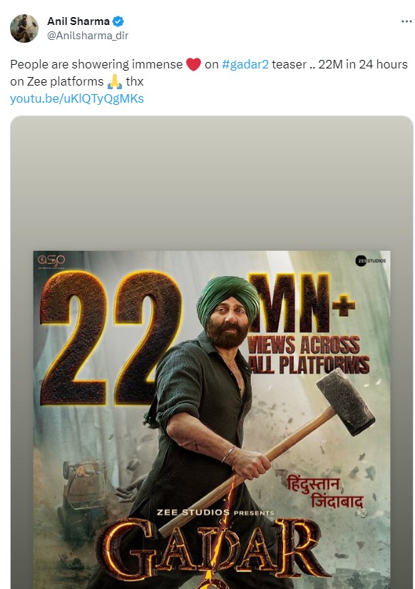 निर्देशक अनिल शर्मा ने ट्विटर पर 'गदर 2' के टीजर पर आए व्यूज को लेकर खुशी जाहिर की है। उन्होंने बताया कि 24 घंटे के अंदर जी प्लेटफॉर्म पर 'गदर 2' के टीजर को 22 मिलियन लोगों ने देख डाला। उन्होंने हैंड फोल्ड वाली इमोजी के साथ लोगों का धन्यवाद किया।