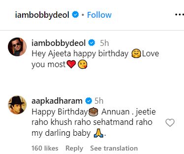 बॉबी देओल के अलावा पिता धर्मेंद्र ने भी बेटी अजीता को उनके जन्मदिन पर विश किया। उन्होंने अजीता को बर्थडे विश करते हुए लिखा, "जन्मदिन मुबारक हो अनुअन, जीती रहो, खुश रहो, सेहतमंद रहो, मेरी डार्लिंग बेबी, आपको हमेशा ढेर सारा प्यार"। सोशल मीडिया पर भी फैंस सनी देओल की बहन को जन्मदिन की बधाई दे रहे हैं।