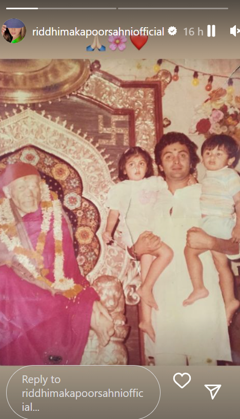 रिद्धिमा कपूर साहनी ने अपने सोशल मीडिया हैंडल इंस्टाग्राम पर अपने पिता ऋषि कपूर और भाई रणबीर कपूर के साथ बचपन की एक प्यारी सी तस्वीर साझा की है। इस तस्वीर में एक्टर भाई-बहन की जोड़ी को अपनी बाहों में पकड़े हुए दिखाई दे रहे हैं। तस्वीर मंदिर की लग रही है, क्योंकि ऋषि कपूर, रिद्धिमा और रणबीर साईं बाबा की मूर्ति के पास खड़े हैं। तस्वीर शेयर करते हुए रिद्धिमा ने इमोजी भी शेयर किए हैं। ऋषि कपूर की यह तस्वीर उनके फैंस के लिए किसी गिफ्ट से कम नहीं है।